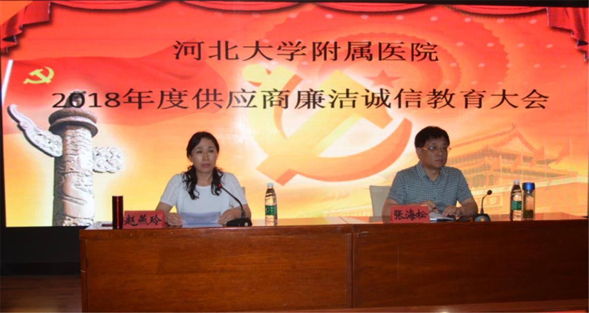 为营造诚信、和谐、廉洁的医院环境,6月4日下午,我院纪委组织召开了2018年度供应商廉洁诚信教育大会。院长张海松、纪委书记赵燕玲出席了大会,与我院有采购关系的设备、耗材、药品、试剂、基建、物资供应商代表122人和我院重点岗位相关人员参加了此次会议。会议由纪检监察室主任杜娟主持。