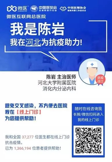 来发热门诊就诊的患者中,经常会有患者出现焦虑、紧张、情绪激动的情况,他都会非常耐心地给患者做好解释、安慰工作。一次值班时,来了一位发热年轻女患者,做完检查后需要留院隔离观察,她哭了,说什么也不肯办理留观手续。陈岩立刻上前了解情况,原来这位患者的孩子才3个月还在吃母乳。他向患者解释道:“您现在生病了,留院观察是为了方便治疗,也是对家人的保护。”经过耐心劝说,患者擦干眼泪立刻办理了留观手续。患者完全康复后还专程跑到发热门诊向陈岩致谢。穿着厚重的防护服,陈岩尽量不去喝水,有一次出汗较多险些晕倒,同事们劝他休息休息,他说:“没事的,我还能坚持,放心吧!”他还总是指着自己脸上的勒痕笑着说:“又给我颁发'勋章'了,这是我做过最勇敢的选择,加油!”工作之余,陈岩总想着怎么能为武汉做点事儿。有一天恰巧收到一个网络平台发来的信息,是微信医生互联网总医院在招募医生,可以为不方便去医院的患者在网上进行义诊,他毫不犹豫加入了“微医”的网络义诊活动,他利用休息时间为武汉市及周边地区群众提供线上病情咨询400余人次。