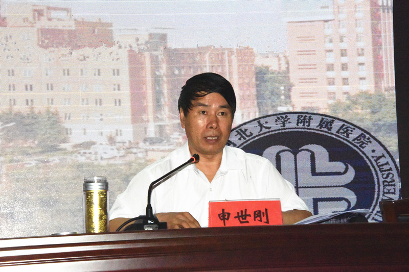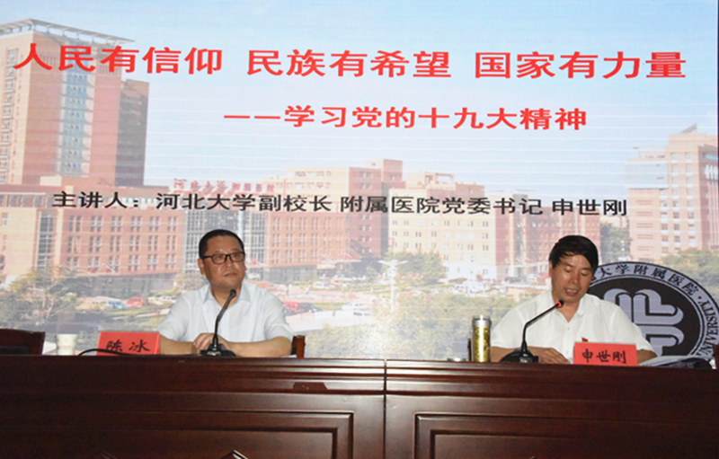 为学习宣传贯彻党的十九大精神和习近平新时代中国特色社会主义思想,7月14日下午,河北大学副校长、我院党委书记申世刚对临床医生做主题为“人民有信仰 国家有力量 民族有希望”的十九大精神系列报告会,党委副书记陈冰出席并主持报告会。此次报告会为第四场报告会,此前已对我院中层干部、行政后勤人员、护理人员分别开展系列宣讲。