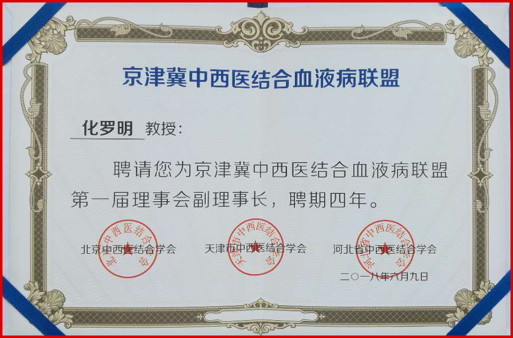 , 化罗明教授被聘请为京津冀中西医结合血液病联盟第一届理事会副理事长。