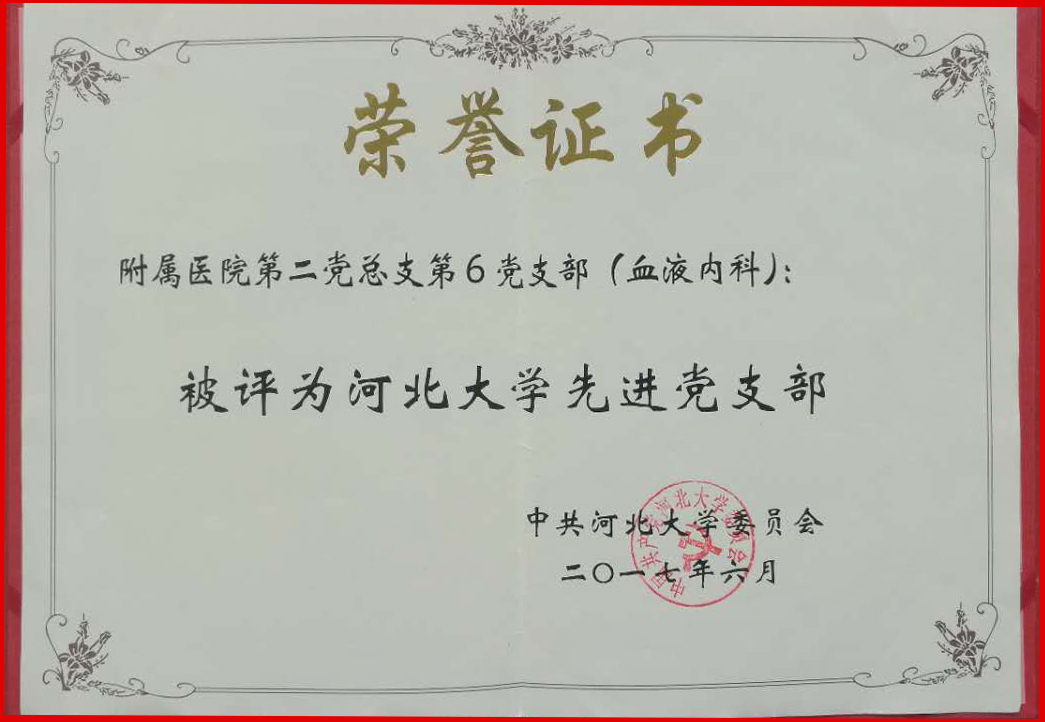 , (血液内科)hy590海洋之神检测中心第二党总支第6党支部被评为河北大学先进党支部..