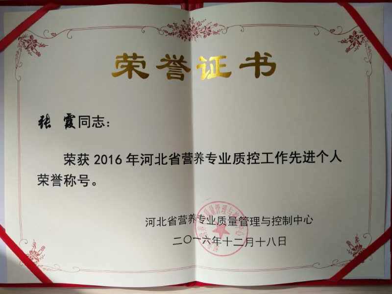 张霞主任荣获2016年河北省营养专业质控工作先进个人荣誉称号