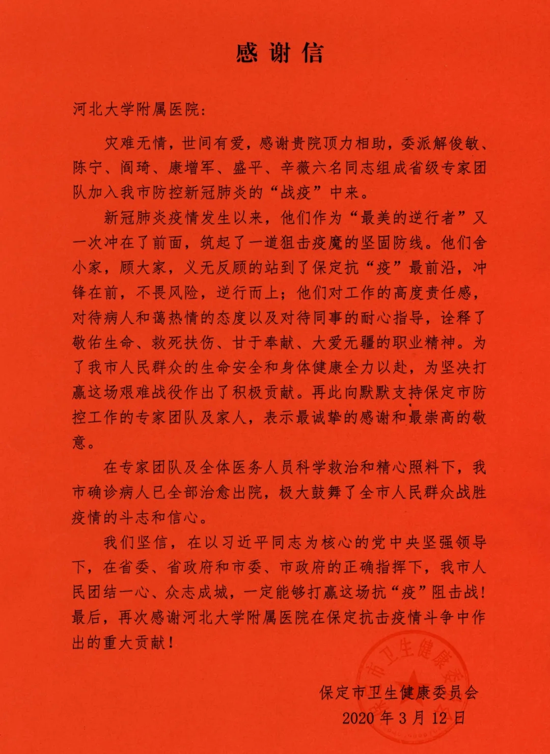 新冠肺炎疫情发生以来,保定市积极应对,在专家团队和全体医务人员的科学救治、精心照料下,我市确诊病例已全部治愈出院。3月12日,保定市卫生健康委员会特此发来信函,感谢我院解俊敏、陈宁、阎琦、康增军、盛平、辛薇六名同志为保卫我市人民群众的生命安全和身体健康作出的积极贡献。