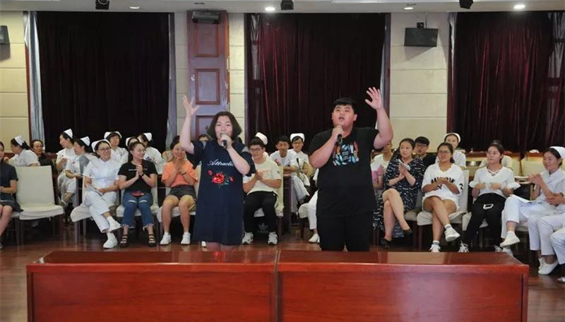 报告会在急诊医学科冯旭、心血管内科三病区杨静两位主持人的精彩主持下拉开序幕,电子大屏幕中播放了新入职护士在岗前培训的精彩瞬间,记录了培训过程中的点点滴滴。报告会分4大模块,分别为护理操作技能展示、情景剧表演、心得体会演讲及才艺展示。在8项护理操作技能表演中,充分展示了我院白衣天使的自信与风采;应用CICARE沟通模式的11个情景剧表演,再现晨会交班、入院介绍、出院介绍、护理操作、转换科室、催款缴费等临床场景,给患者带来不一样的住院体验,同时通过现场互动,燃起了大家做好温馨服务的激情,CICARE沟通从心开始,新入职护士饱含深情的演唱《感恩的心》感动全场,大家合唱的一首《爱的奉献》把气氛推向了高潮。