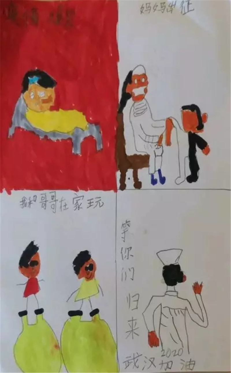 刘兰的孩子用稚嫩彩画表达着对妈妈的爱与支持,“等你们归来,武汉加油!”道出了我们大家的心声。