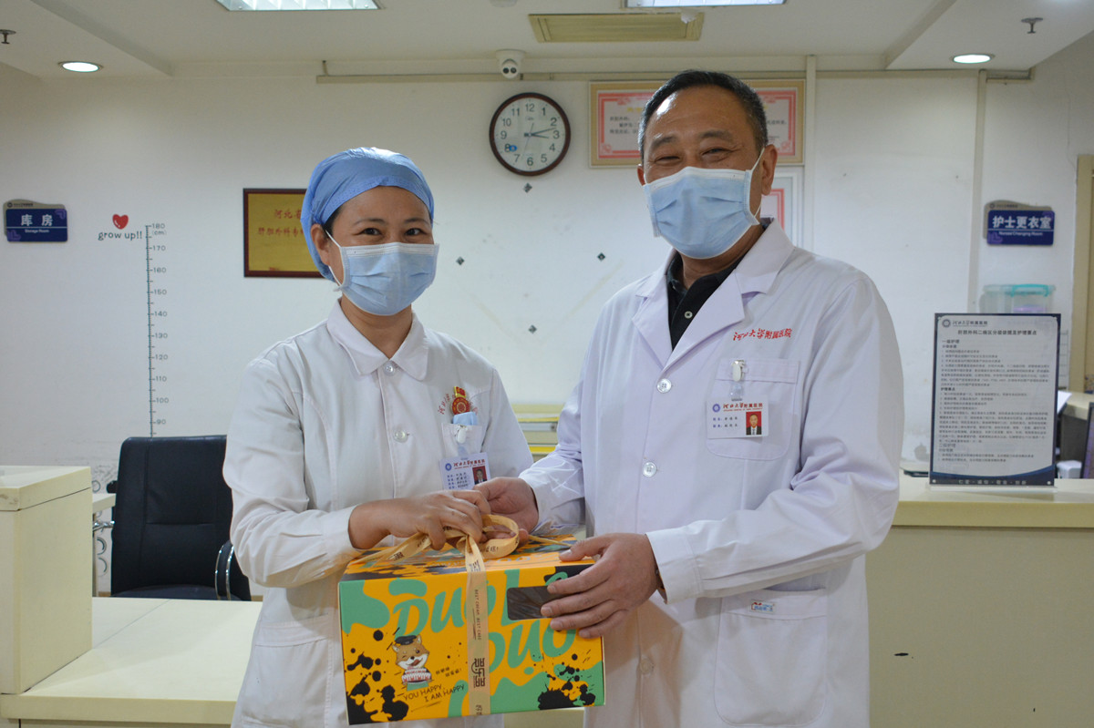 程树杰对护理人员一直以来的默默付出给予了高度评价,感谢他们在抗击新冠肺炎和日常工作中做出的积极贡献。李汉才向全院护理工作者致以节日的祝贺和诚挚的慰问。史彦芳表示,护理队伍与医生并肩作战,诠释了“敬佑生命、救死扶伤、甘于奉献、大爱无疆”的职业精神。齐文杰等院领导祝全院护理人员节日快乐,在今后的工作中取得更大的成绩。每到一处,院领导都亲切地向护理人员送上节日的祝福和慰问,送上鲜花和蛋糕。一句句暖心的问候、一束束美丽的鲜花和精美的蛋糕表达了院领导对护理人员的深切关怀。慰问现场氛围温暖,大家热情高涨,倍受鼓舞。